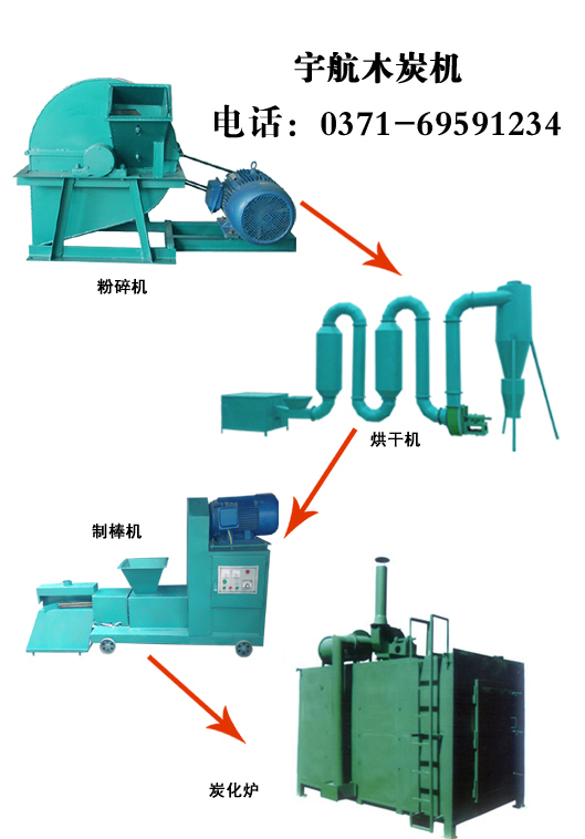 環(huán)保木炭機設備是把原料竹木鋸末、花生殼、玉米棒、甘蔗渣、棉花稈、玉米稈、稻谷殼、雜樹枝等經(jīng)木屑粉碎機粉碎成 10mm之內(nèi)的顆粒狀,經(jīng)烘干機烘干使之含水份含量在12%以內(nèi),入制棒機經(jīng)高溫,高壓使之成型后放入炭化爐進行炭化, 即成成品木炭。該產(chǎn)品密度大、體積小、可燃性好,是一種新型的環(huán)保清潔木炭,可替代薪柴及燃煤,尤其適用于北方地 區(qū)秋冬燒炕取暖、大棚升溫或作普通生活燃料。環(huán)保木炭機價格不高,效果卻十分明顯。廣泛應用在餐飲,農(nóng)業(yè),工業(yè)等 眾多領域。